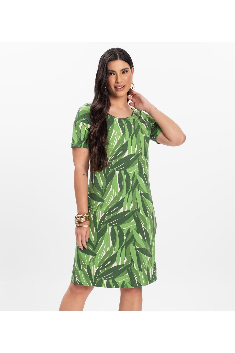 O Vestido Curto Rovitex é confeccionado em malha de viscose, oferecendo conforto e maciez ao vestir. Com decote redondo, possui um design versátil e feminino, perfeito para diversas ocasiões. Suas mangas curtas proporcionam liberdade de movimento e frescor. O caimento do vestido na altura dos joelhos confere um visual elegante e moderno. A malha de viscose é leve e respirável, proporcionando um toque suave na pele.-