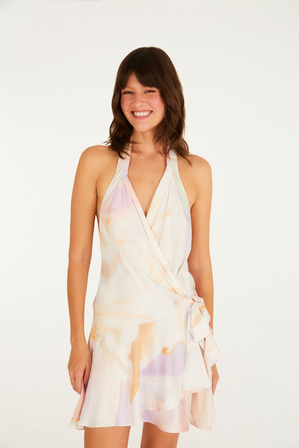 vestido curto estampado transpassado maxi pérola. possui decote halter e design transpassado, criando um caimento fluido e elegante para variadas ocasiões, do casual ao sofisticado. confeccionado em tecido leve, o modelo é perfeito para momentos ao ar livre. FARM RIO original - alto verão 26.-