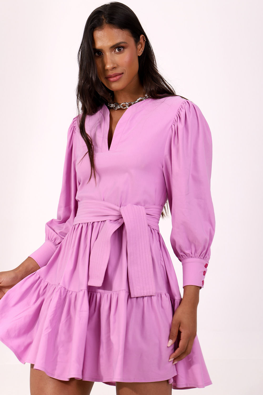 Vestido lilás em bengaline, possui decote v com pala fina acompanhando todo o decote, mangas longas bufantes com drapeado nos ombros e punhos com abotoamento por botões caseados.