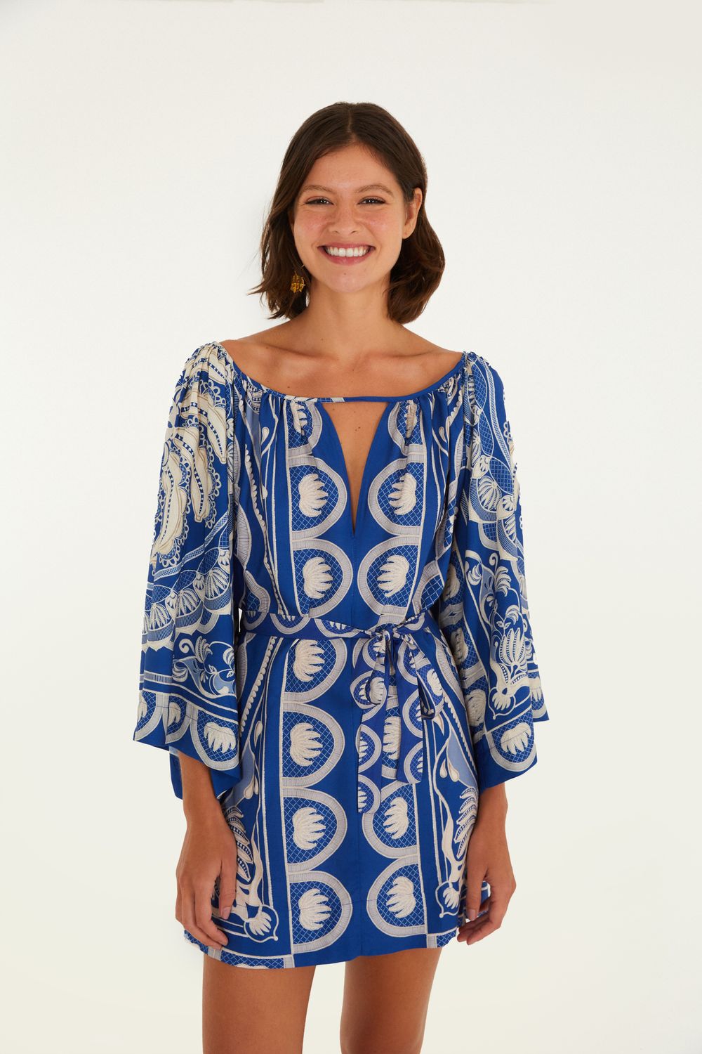 vestido curto manga lenço estampado jardim de banana. apresenta decote canoa com detalhe vazado, perfeito para um toque moderno. as mangas amplas estilo lenço trazem movimento e leveza, enquanto o ajuste na cintura realça o design casual. ideal para passeios ao ar livre e encontros especiais. FARM RIO original - verão 26.-