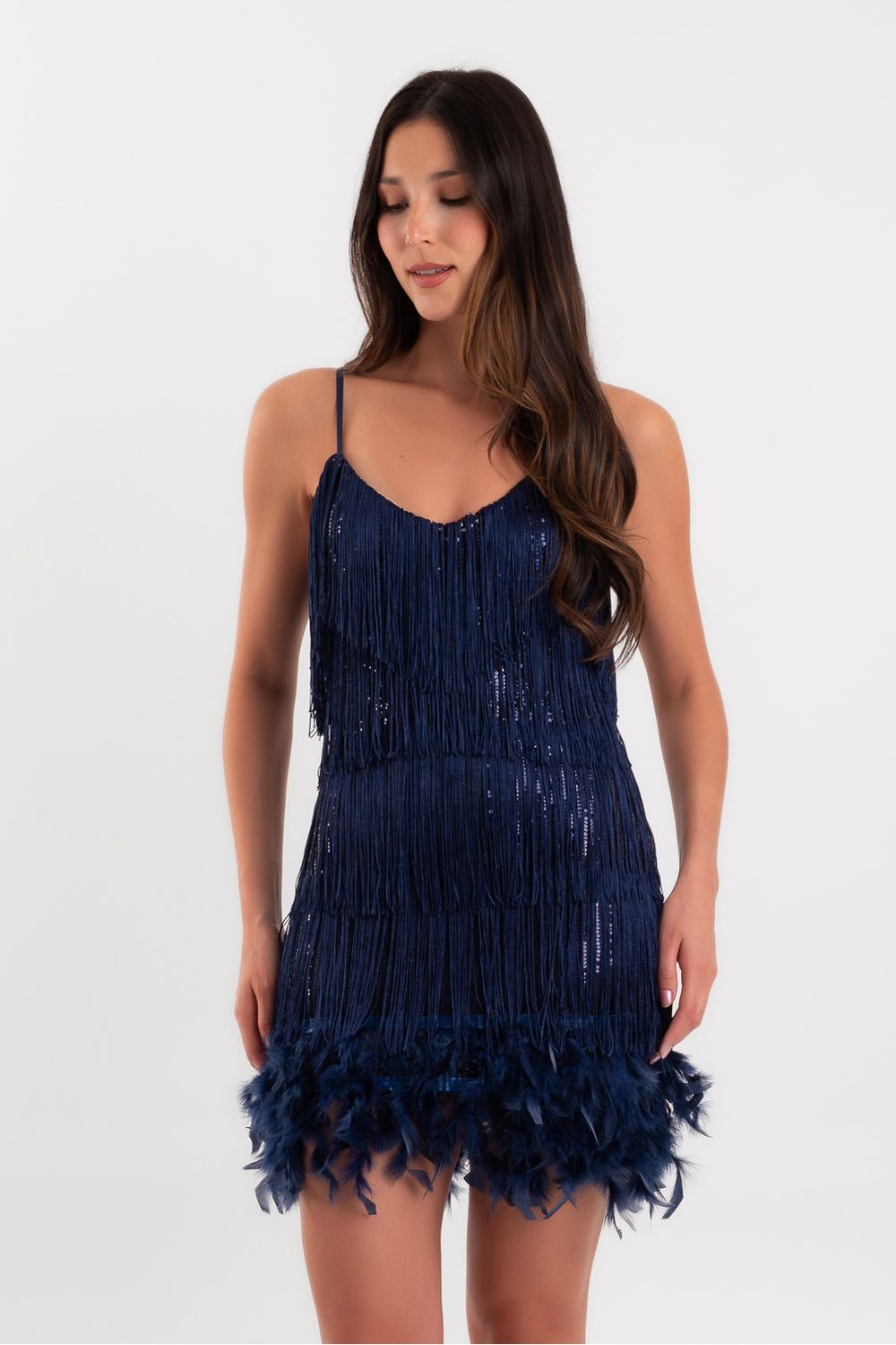 Vestido curto paetê com franjas e plumas forrado azul marinho