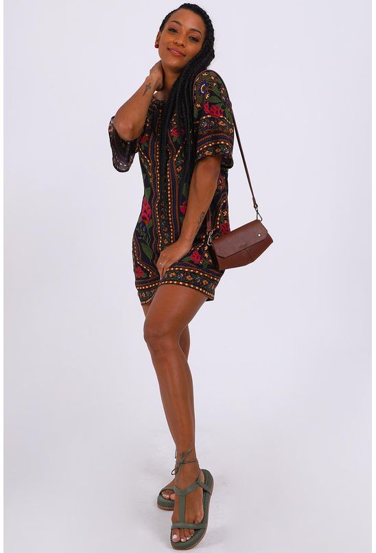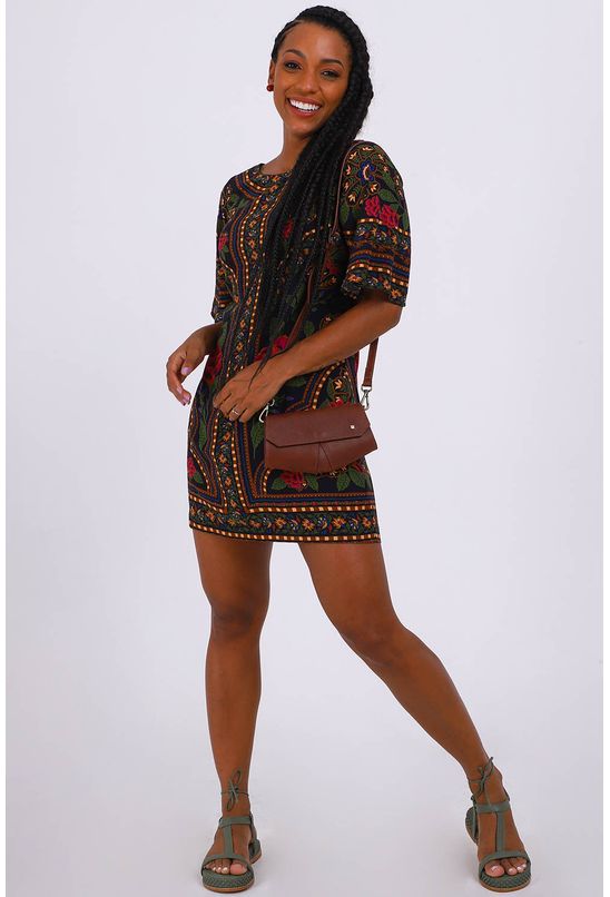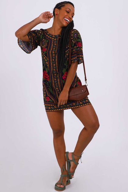 Vestido farm curto, decote canoa, estampado , cor preta, manga 3/4, tecido viscose. *as peças podem variar de estampa e tonalidade.