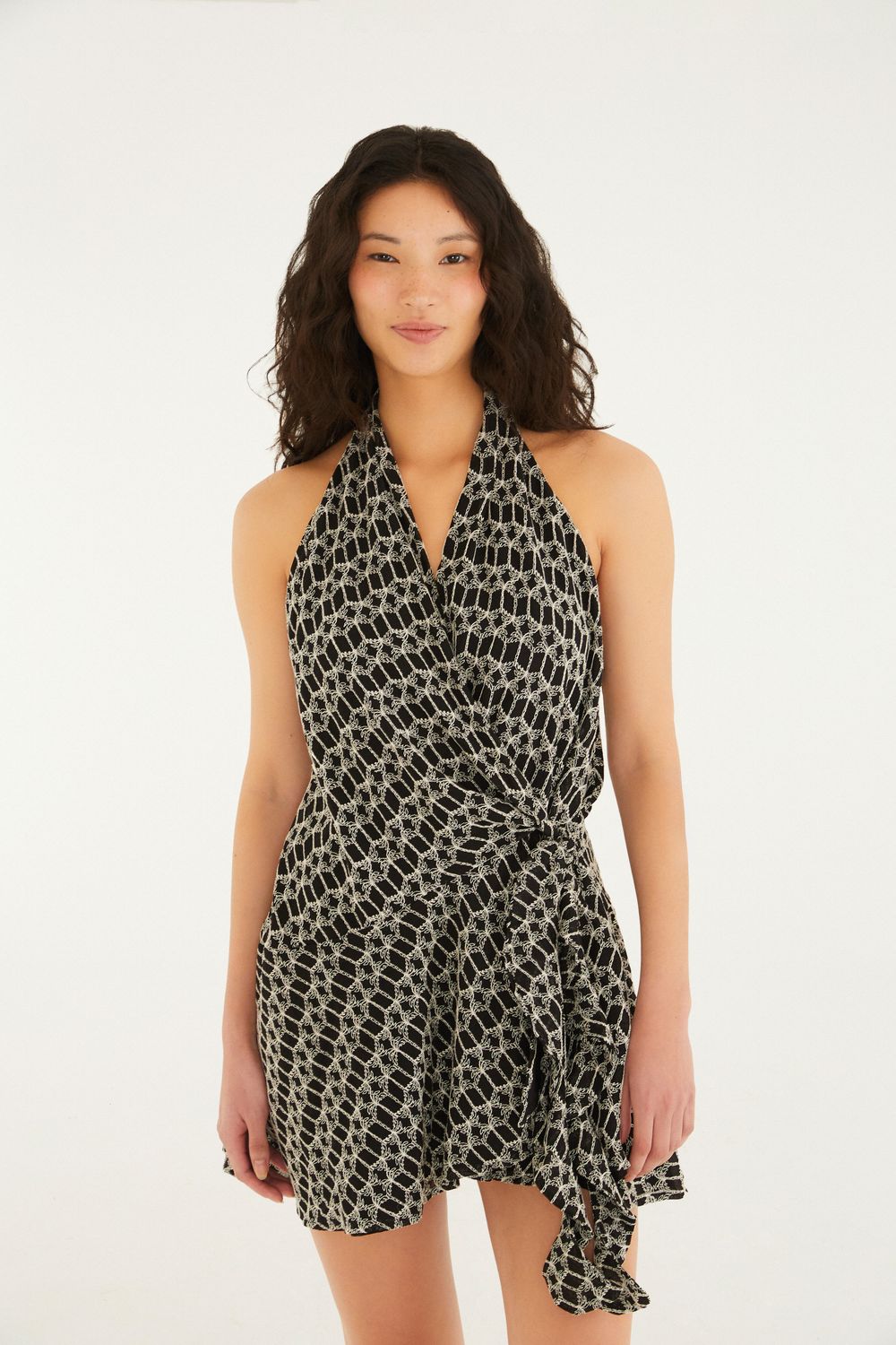 vestido curto transpasse bordado coqueiro captura a essência da leveza. com um decote que destaca os ombros e um transpasse que valoriza a silhueta de forma sutil, ele une conforto e estilo. o bordado delicado eleva a peça, perfeita para um evento casual ou um passeio especial. FARM Rio, coleção Carioca - inverno 26.-