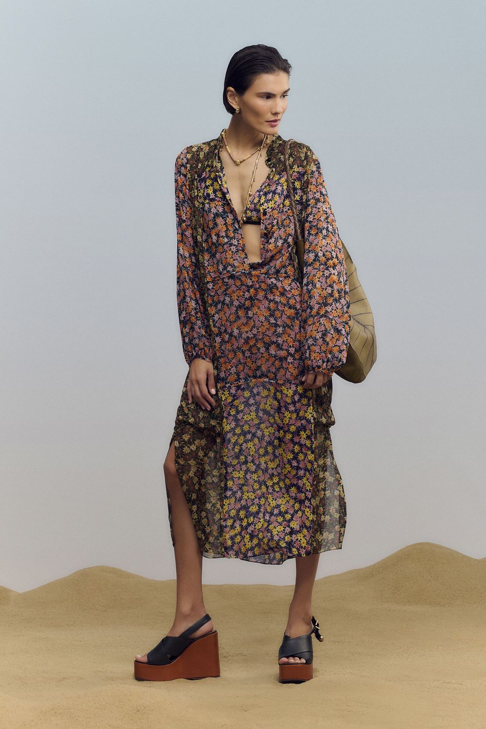 Vestido De Georgette Leve Midi Manga Longa Estampado