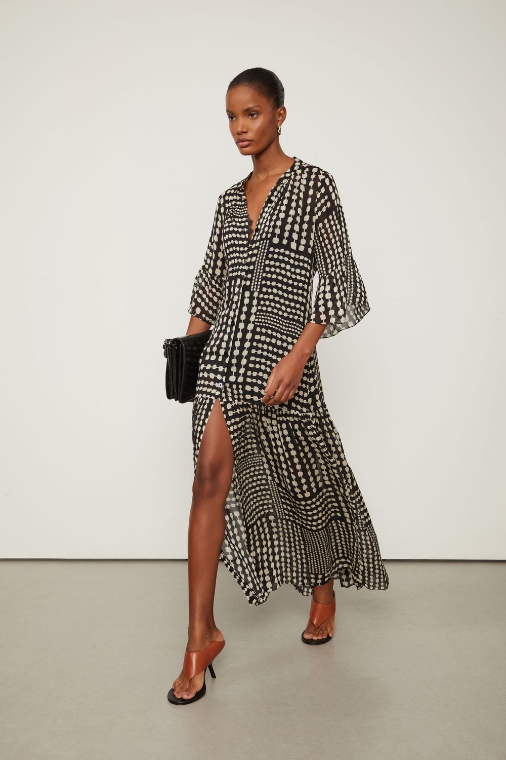Em estampa autêntica do Alto Inverno 25, o Vestido Chemise Longo apresenta abotoamento frontal, decote em V com aplicação de renda e fenda na barra fluida, traduzindo leveza e movimento. Sandálias e acessórios minimalistas complementam a proposta elegante e atemporal. Detalhes: - Fechamento por abotoamentos frontal; - Comprimento longo; - Mangas 7/8; - Modelagem evasê; - Fenda frontal; - Decote em V com aplicação de renda.-