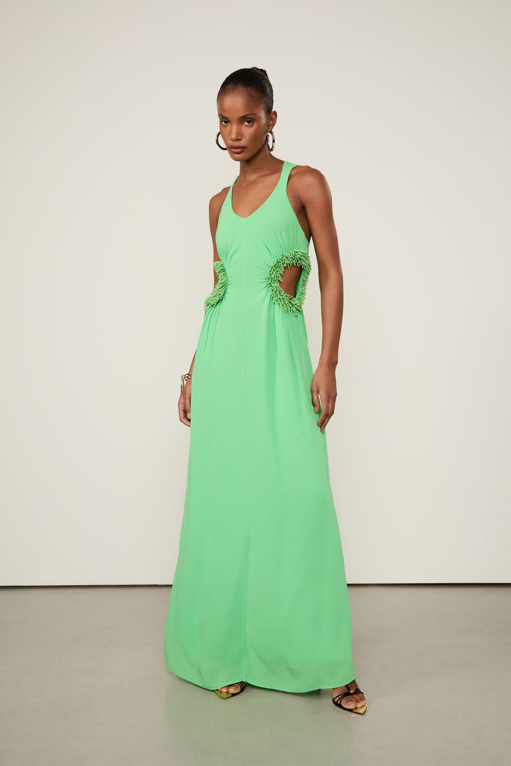 Vestido De Georgette Pesado Longo Verde Proa Com Bordado Ouriço Na Cintura
