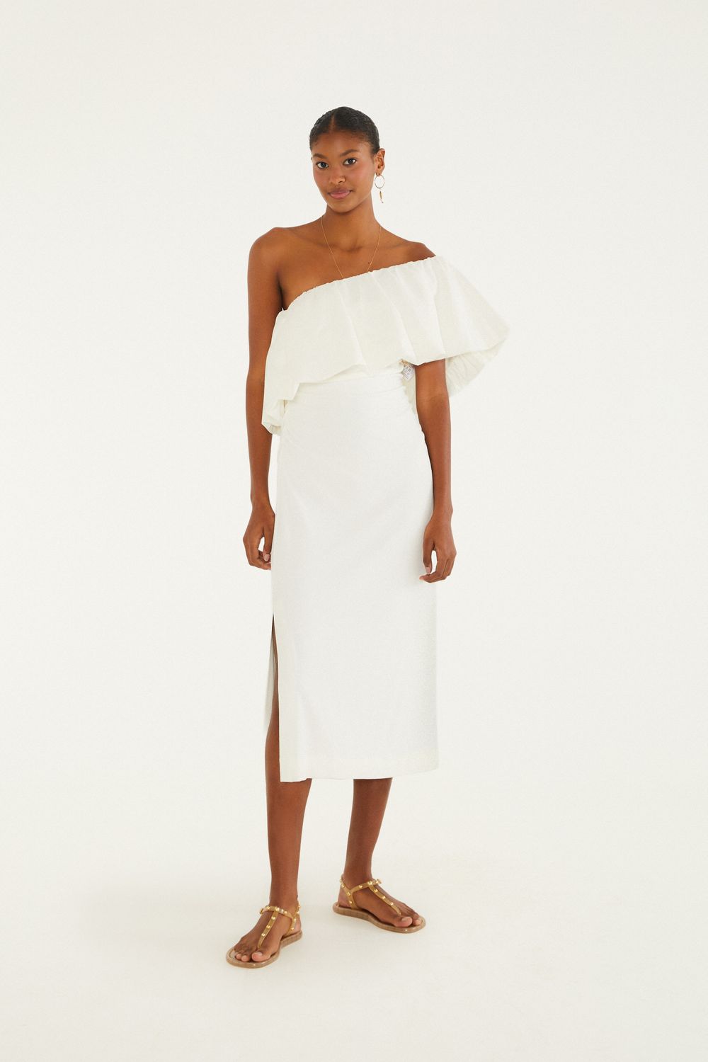 vestido decote balonê. modelo sem alças com ombros à mostra e aplicação de babados, trazendo charme e modernidade à peça. a textura fluida e caimento leve fazem dele um item ideal para jantares ao pôr do sol ou aquela confraternização especial. combina com sandálias rasteiras e acessórios marcantes. FARM RIO original - alto verão 26.-