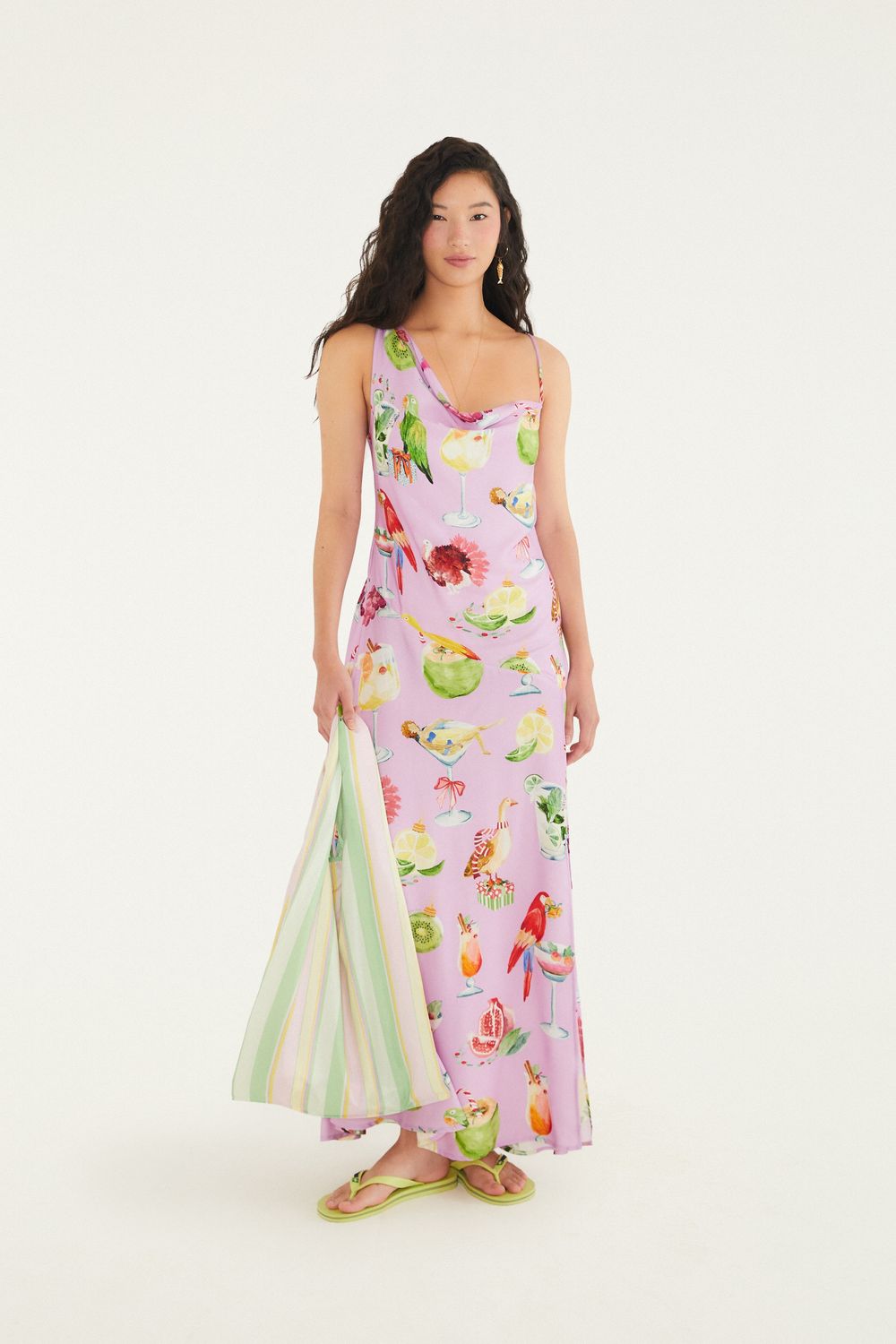 vestido decote degagê estampado coquetel lilás. com decote degagê charmoso e alças finas, este vestido longo encanta pela leveza e movimento. sua modelagem fluida é perfeita para momentos casuais e eventos especiais. uma peça que exala originalidade e versatilidade. FARM RIO original - alto verão 26.-