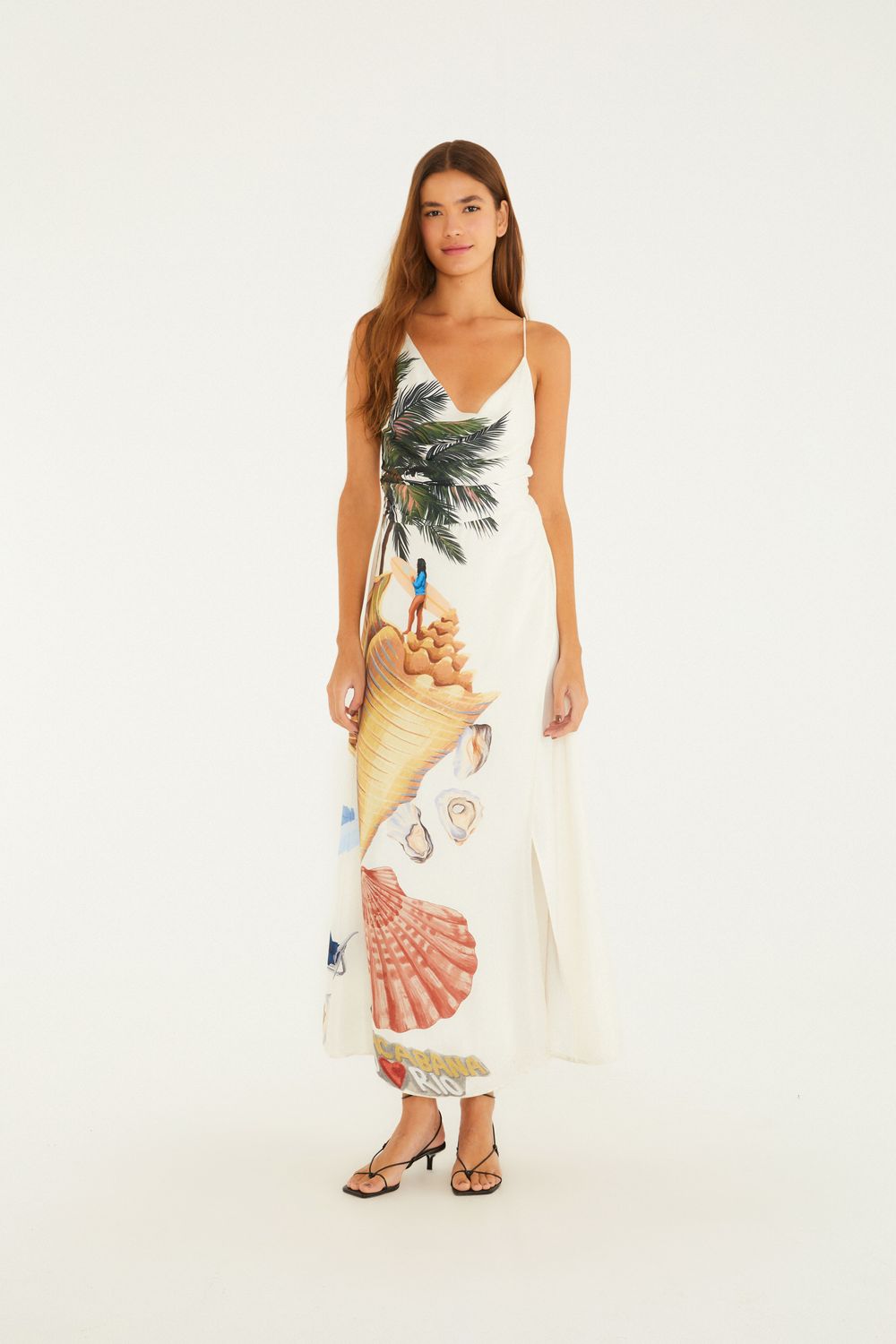 vestido degage colagem carioca. possui decote em v profundo valorizando o busto e alças finas que se cruzam nas costas, definindo um estilo casual e sofisticado. a saia fluida com fenda lateral traz movimento e leveza, ideal para um dia na praia ou um passeio ao ar livre. FARM Rio, coleção Carioca - inverno 26.-