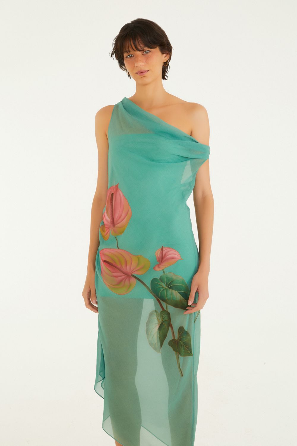 vestido estampado anturio. confeccionado em tecido leve e fluido, traz frescor e leveza com design sem alças e elegante detalhe de ombro a ombro, criando uma silhueta fluida ideal tanto para um passeio casual quanto para uma celebração especial. a peça é um convite ao charme e à criatividade. FARM RIO original - verão 26.-