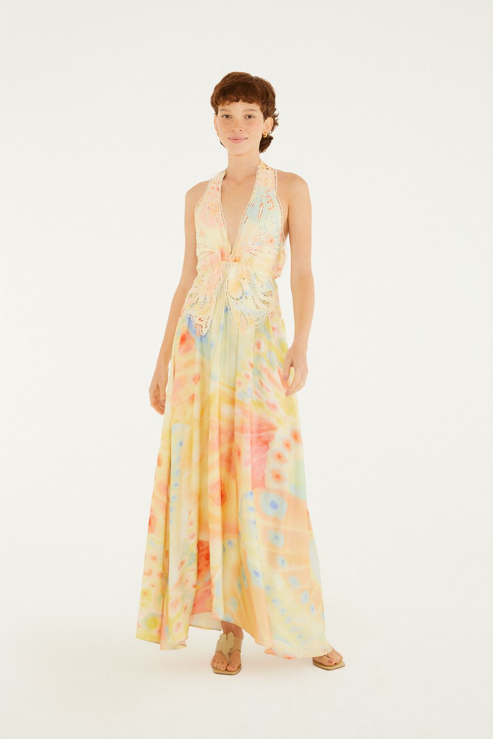 vestido estampado asas. com alças finas e decote profundo, o vestido une charme e frescor em um corte fluido. sua cintura é levemente acentuada, trazendo leveza e movimento. ideal para passeios à beira-mar ou eventos casuais ao ar livre. sua presença é marcante em qualquer ocasião. FARM RIO original - alto verão 26.-