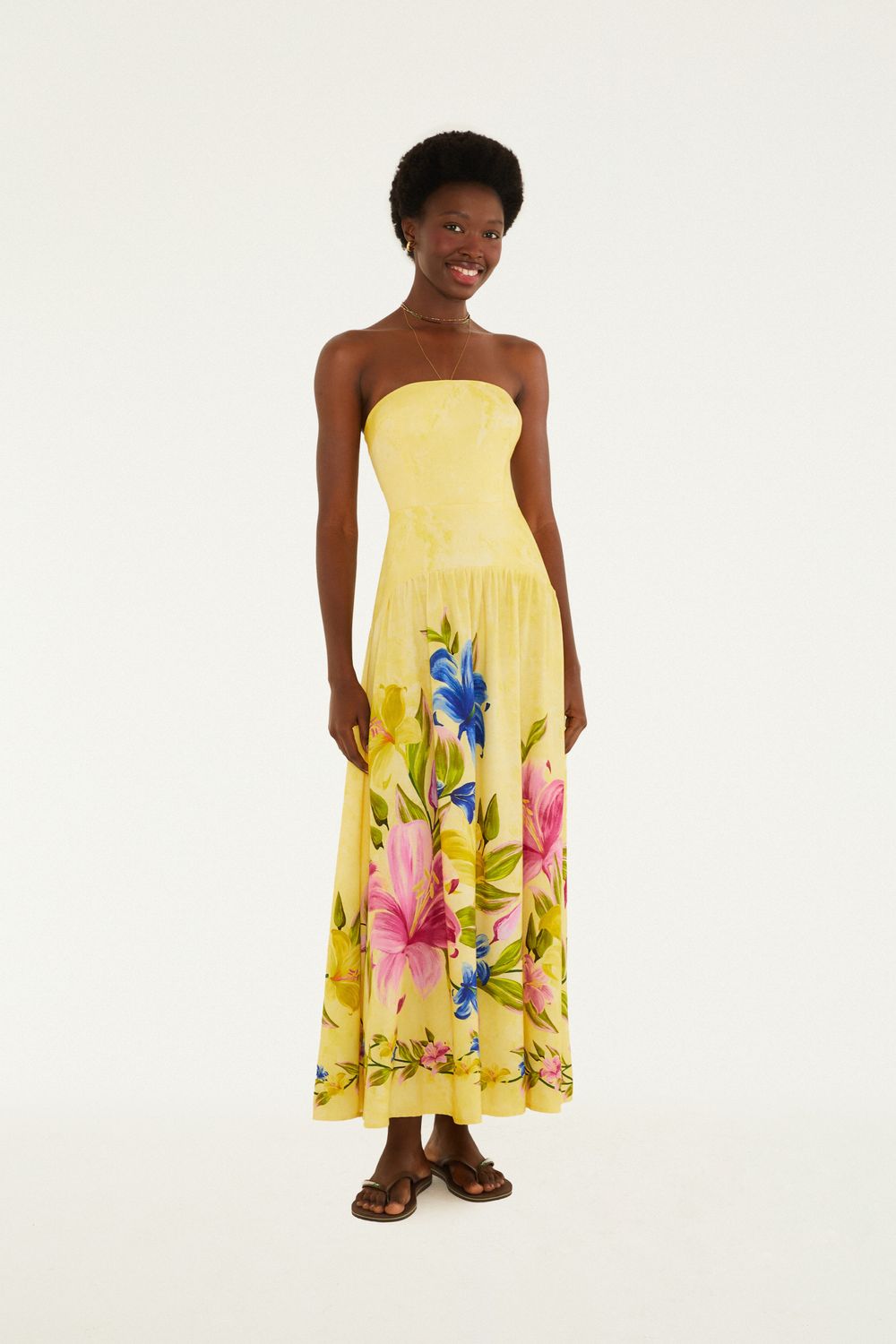 vestido estampado malu lenço. sem alças e com ombros à mostra, valorizando um look casual. modelagem fluida, com caimento leve que proporciona movimento. o toque especial fica por conta dos detalhes laterais com amarração, criando um charme único. ideal para um passeio à beira-mar ou um brunch ensolarado. FARM RIO original - alto verão 26.-