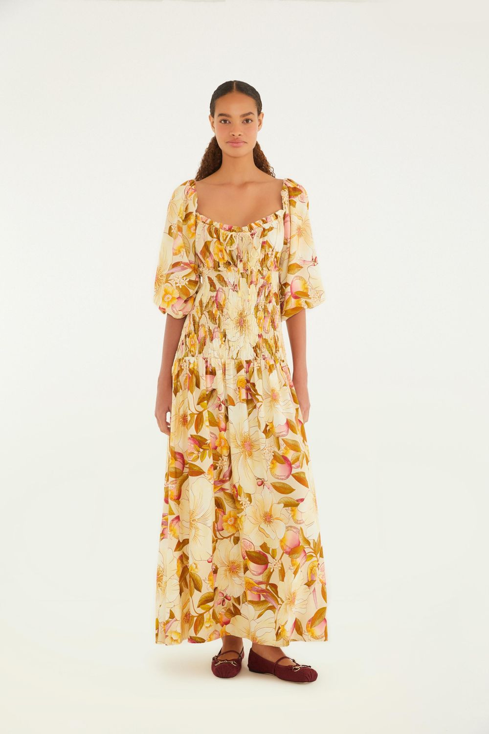 vestido estampado romance de flor. este modelo possui decote quadrado com delicados franzidos, mangas bufantes três quartos com elástico nos punhos e caimento fluido até os pés. um cordão ajustável enfeita o busto, trazendo um toque charmoso. ideal para ocasiões casuais ou eventos especiais. FARM RIO original - alto inverno 25.-