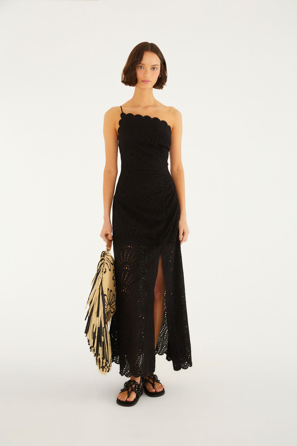 Vestido longo preto com corset e alças finas babado
