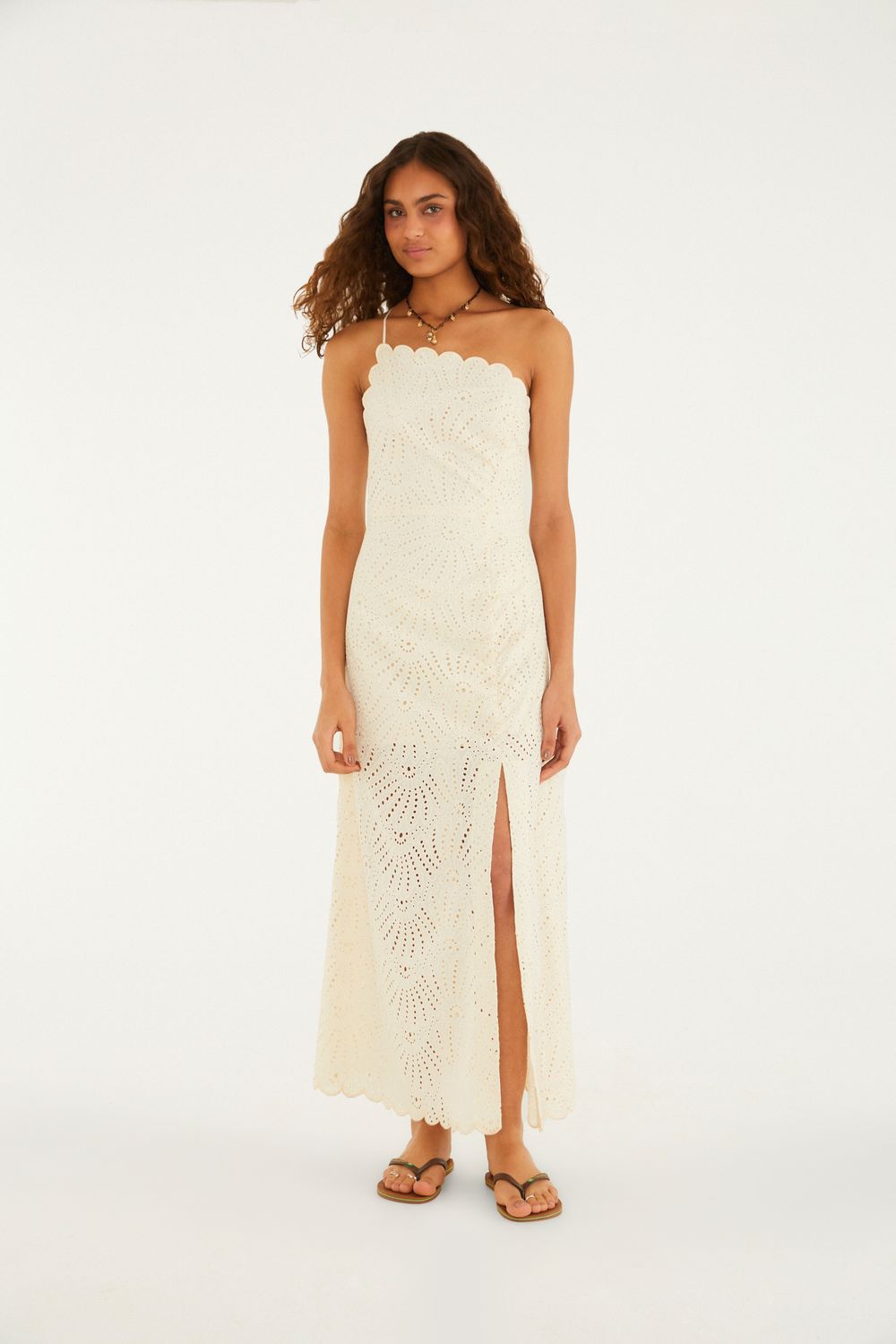 vestido franzido laise de banana. sem alças e com forro confortável, destaca-se pelo corte evasê e detalhes minuciosos em laise. a fenda frontal adiciona movimento, perfeita para encontros casuais ou eventos à beira-mar. uma peça que combina frescor e autenticidade. FARM Rio, coleção Carioca - inverno 26.-