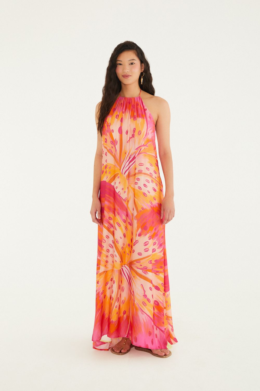 vestido frente única estampado lírio tropical. possui decote halter que traz um toque moderno, com alças finas que se ajustam ao pescoço. a saia solta em tecido leve proporciona movimento e frescor, ideal para momentos casuais ou eventos ao ar livre. um visual único para dias de verão. FARM RIO original - alto verão 26.-