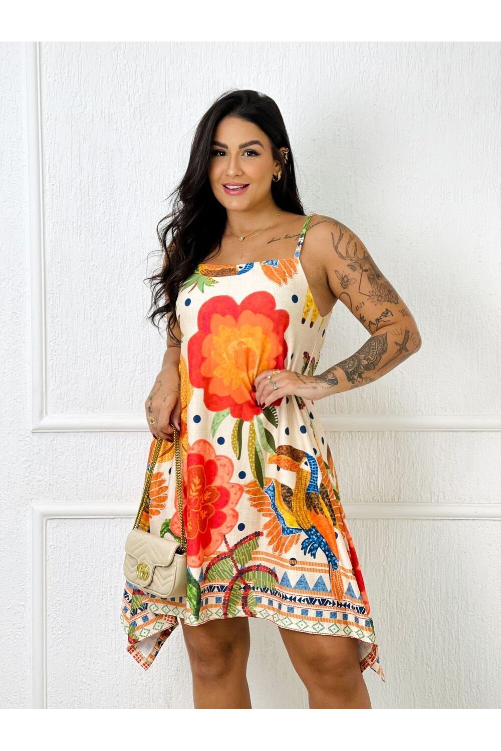 Descubra o charme deste vestido, uma peça que exala alegria e energia. Com sua estampa colorida e exuberante, ele é perfeito para quem deseja um look vibrante e cheio de personalidade para o verão.