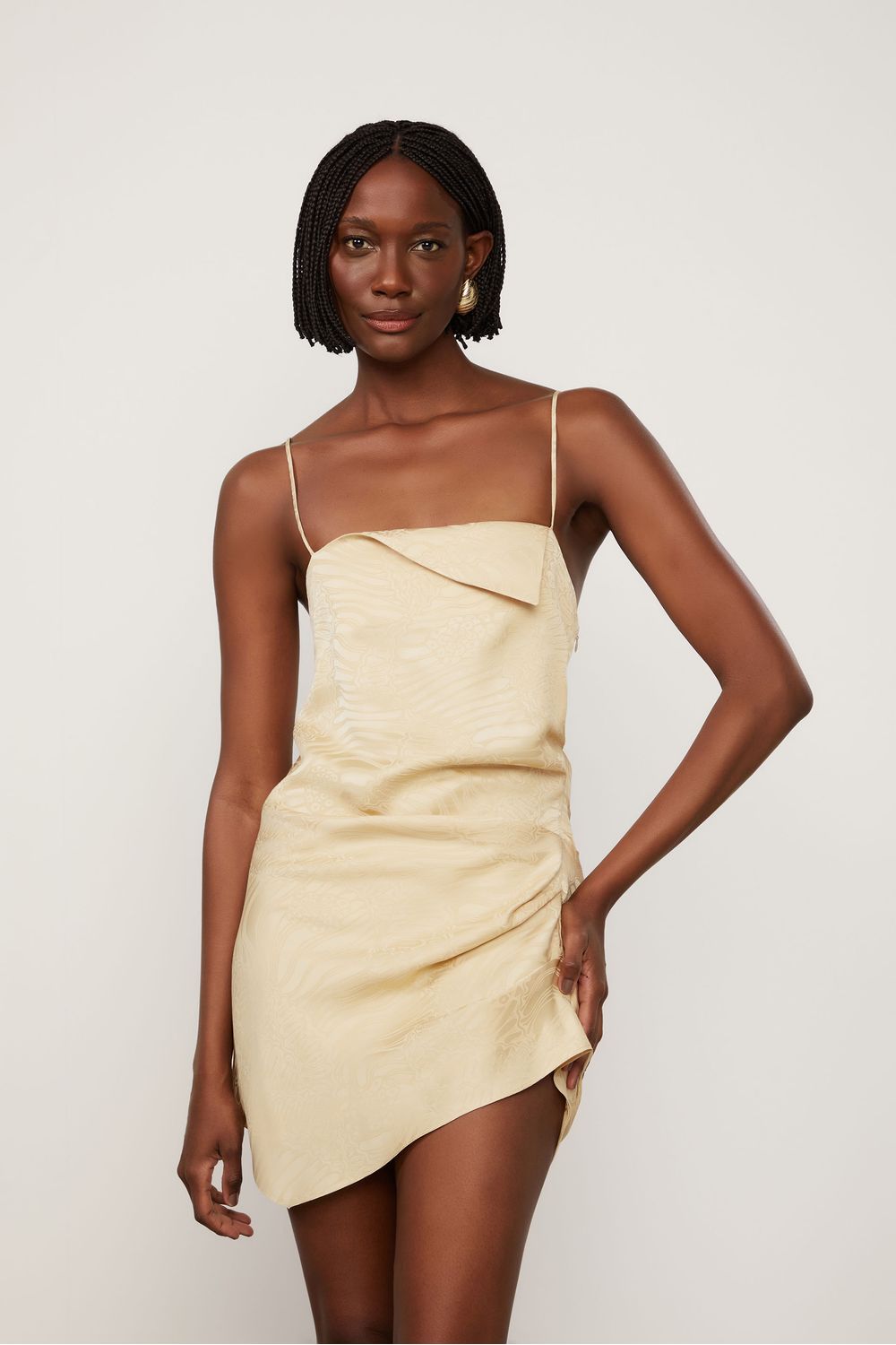 Vestido Jacquard Curto Bege Barra Assimétrica