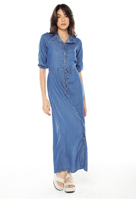 Detalhes: Vestido longo jeans estilo camisa. Fechamento em botões centrais de metal,verdadeiros, abrem até a barra. Manga 3/4 raglã com acabamento em elástico fino. Gola com pé de gola. Canaleta com ajuste em fita do próprio tecido para acinturar. Tecido peso médio, sem transparência, muito macio.