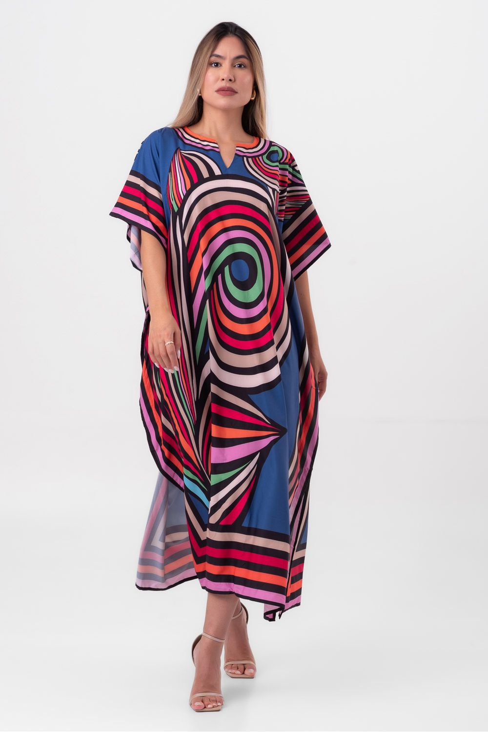 Vestido kaftans com decote v e fendas laterais fios multicolorido