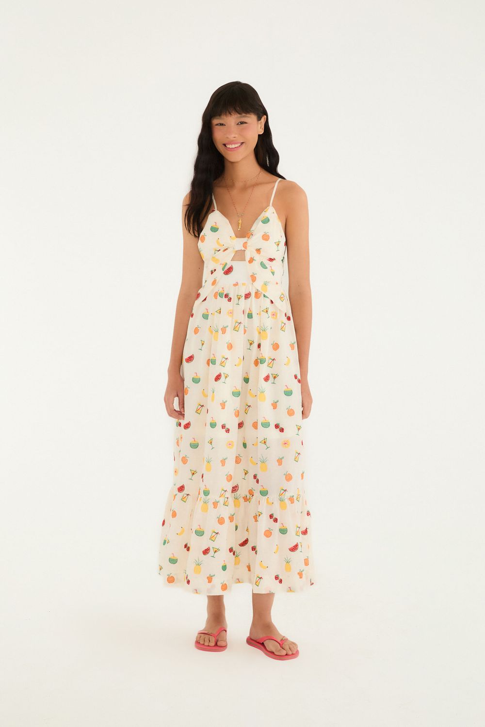vestido laço bordado coquetel. apresenta alças finas ajustáveis e decote em v com detalhe charmoso de laço no busto. o corte fluido e leve é realçado por bordados sutis, trazendo um toque especial. perfeito para um encontro casual ou um passeio ao ar livre. FARM RIO original - alto verão 26.-