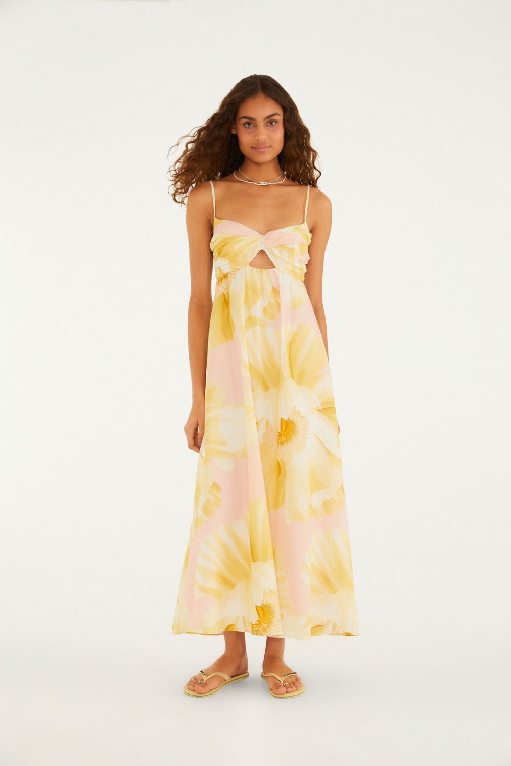 vestido longo alça festa de papoula. alças finas e delicadas abraçam os ombros, complementadas por um corte único no busto, trazendo um toque especial e moderno. a modelagem fluida proporciona liberdade aos movimentos, perfeita para eventos ao ar livre ou celebrações em ambientes descontraídos. FARM Rio, coleção Carioca - inverno 26.-