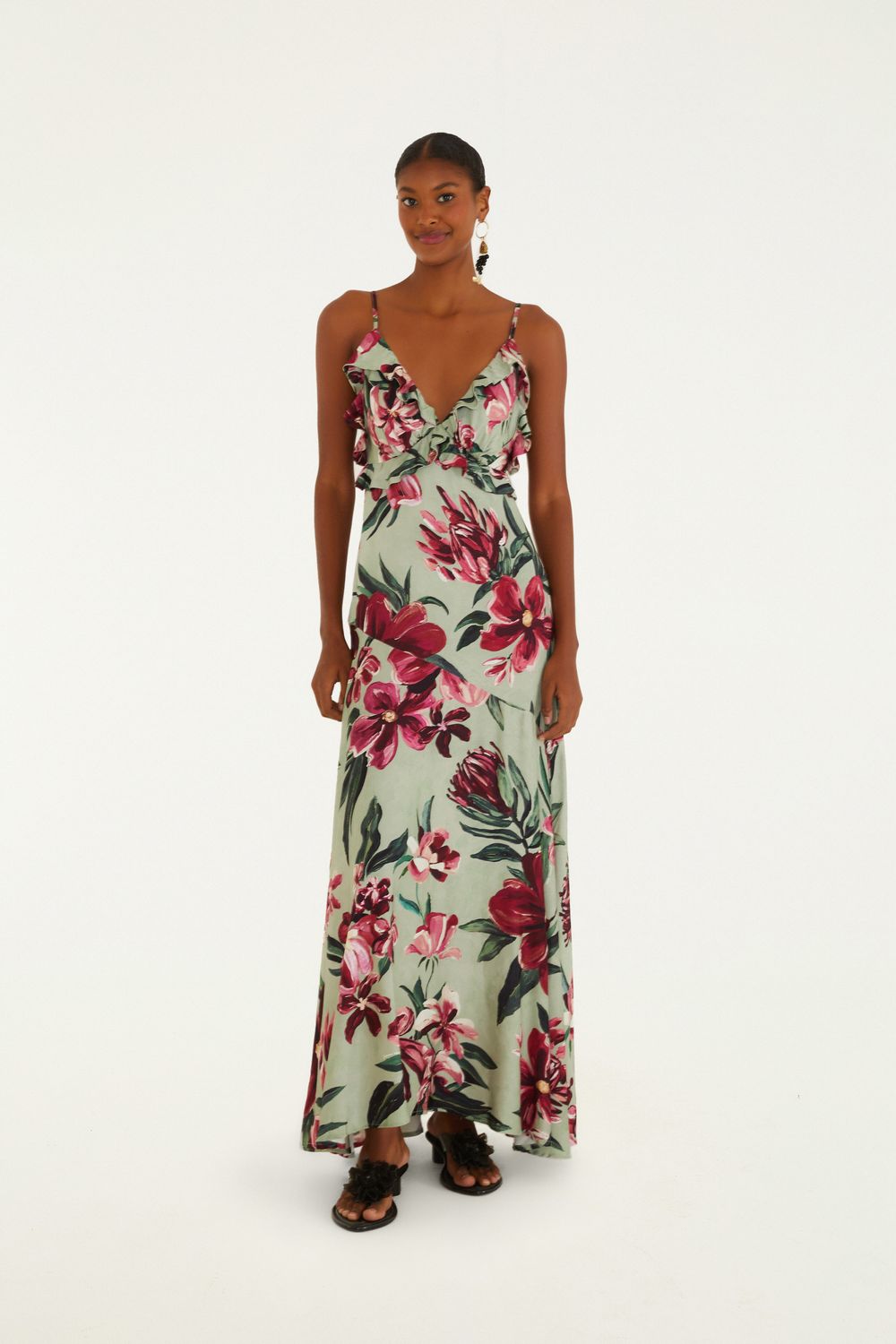 vestido longo alça estampado lineia. com um decote em v e alças finas ajustáveis, este vestido oferece leveza e movimento em uma modelagem fluida. o tecido macio e forrado proporciona conforto, enquanto o design exclusivo é perfeito para ocasiões casuais ou um passeio especial. FARM RIO original - verão 26.-