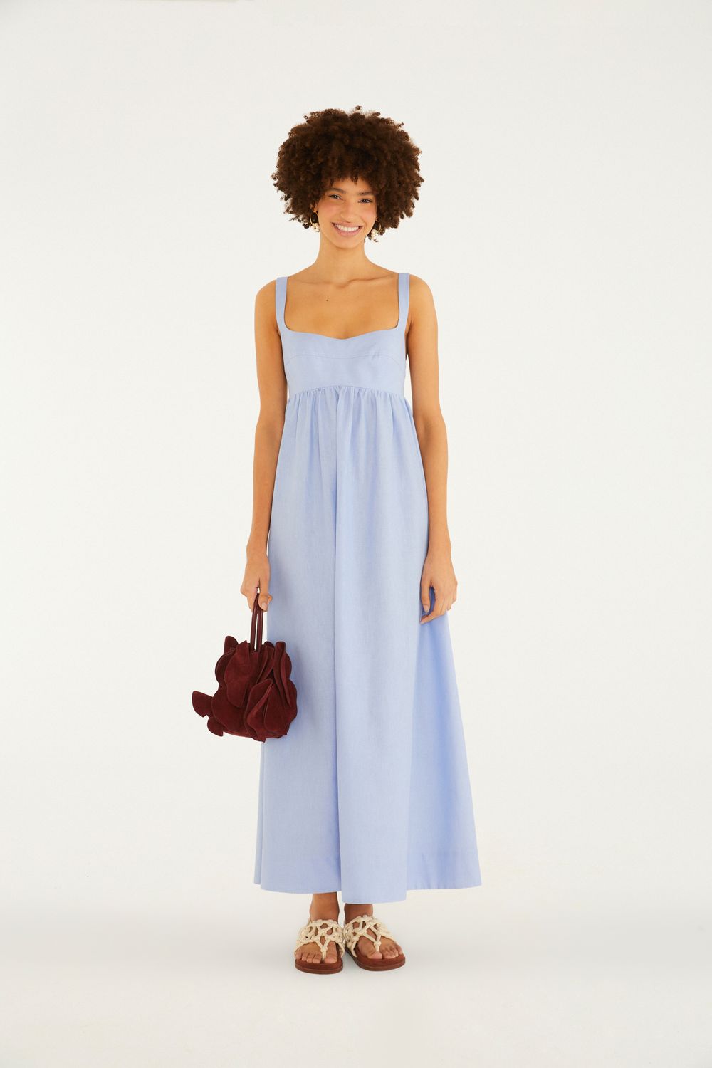vestido longo alças. apresenta um decote suave e alças largas que proporcionam leveza e conforto. a modelagem fluida se destaca com um caimento casual, perfeito para dias ensolarados e eventos ao ar livre. o detalhe nas costas valoriza o design único da peça. FARM Rio, coleção Carioca - inverno 26.-
