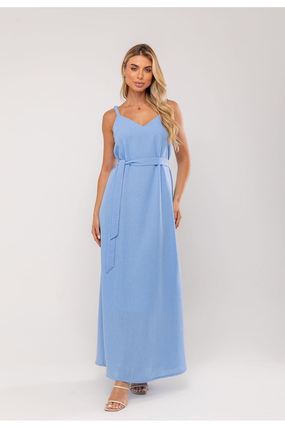 Vestido Longo Com Faixa Na Cintura Azul Salvatore