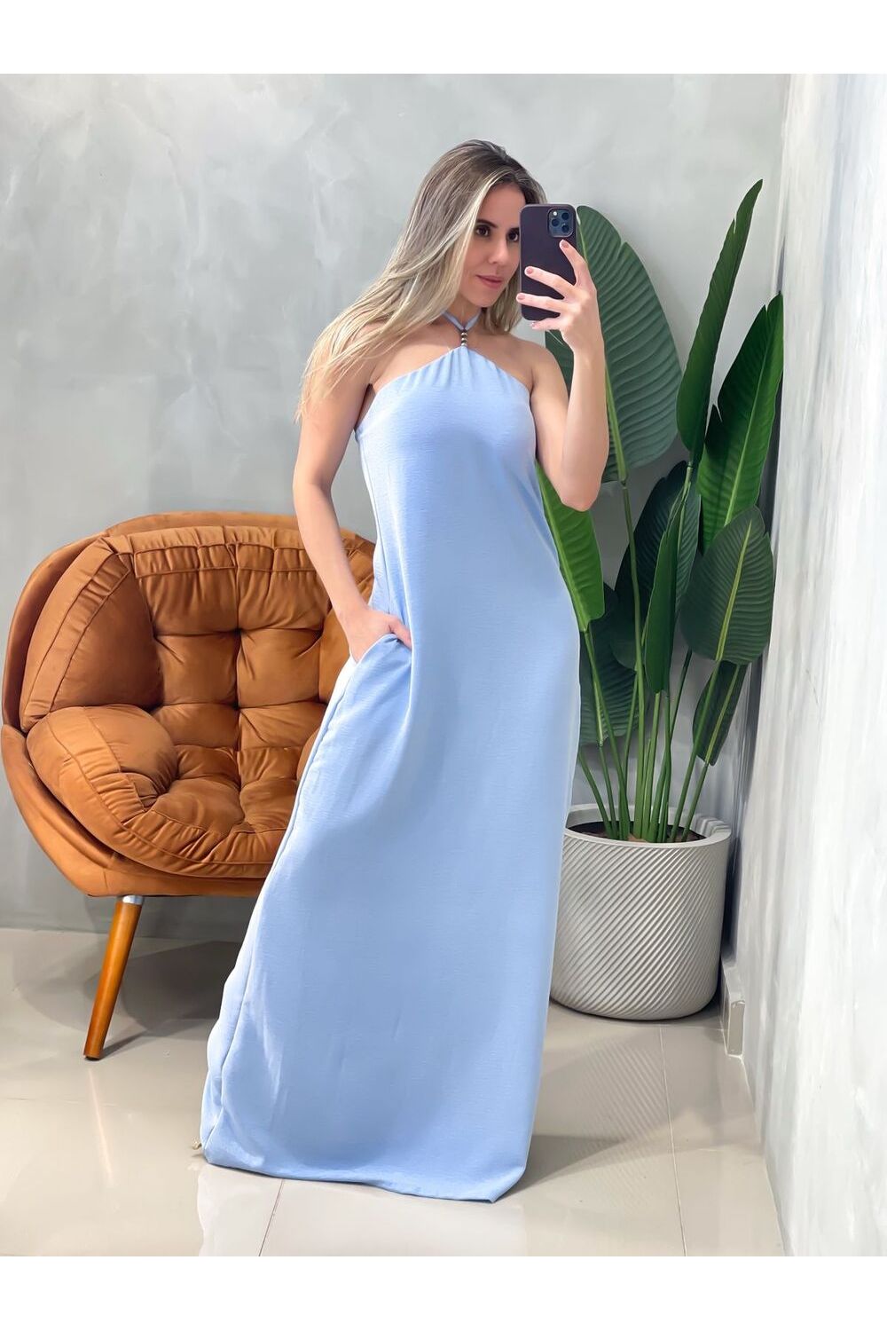 Vestido Longo em Crepe com Fenda e Amarração Adrieli Ref. 1677 - Azul claro - Único