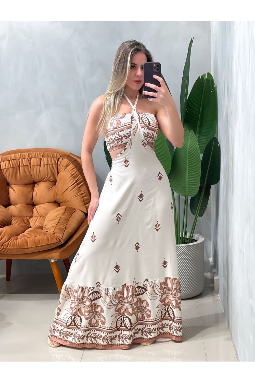 Vestido Longo em Crepe Costas Nua com Amarração Alice Ref. 1779 - Bege - Único
