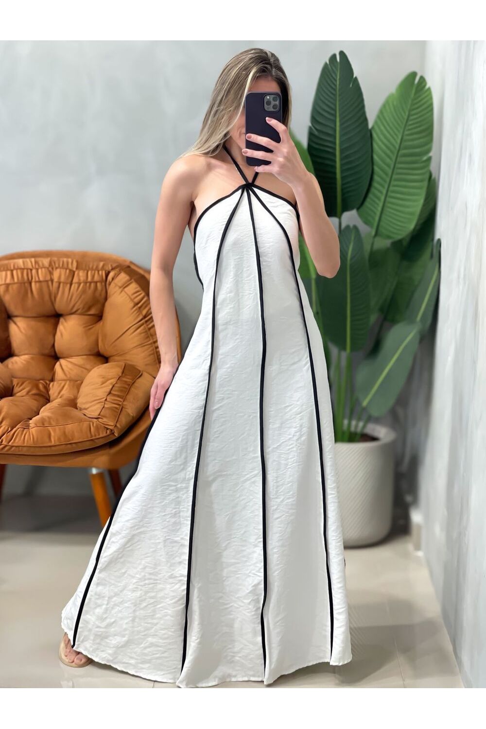 Vestido Longo em Crepinho Frente Única com Amarração e Lastex Heloisa Ref. 1618 - Off white - Único