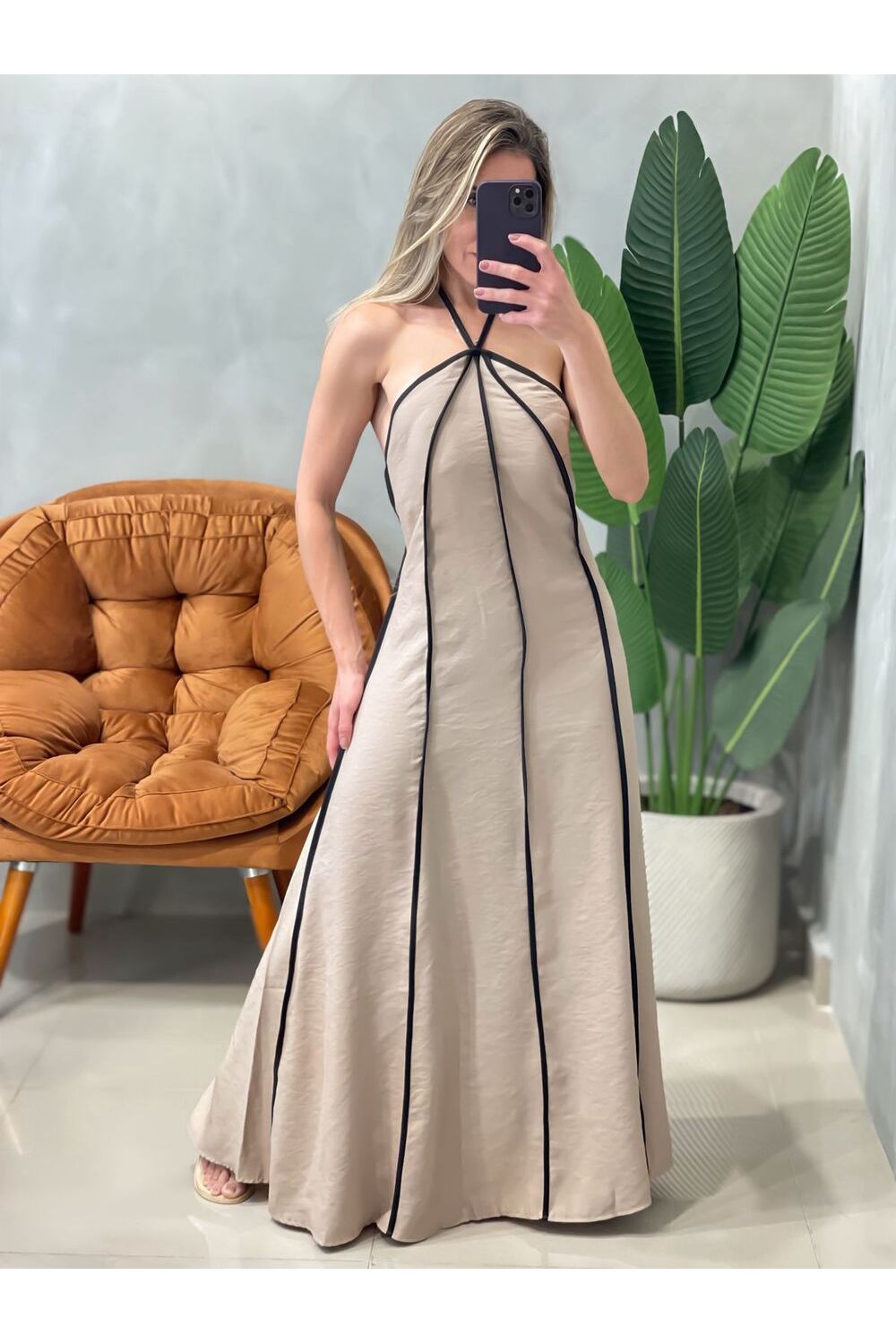 Vestido Longo em Crepinho Frente Única com Amarração e Lastex Heloisa Ref. 1618 - Bege - Único