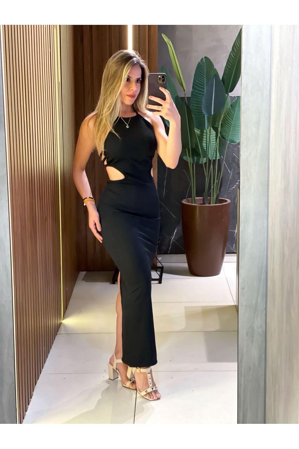 Vestido Longo em Ribana de Alça com Recortes Laterais Geovana Ref. 1763 - Preto - Único
