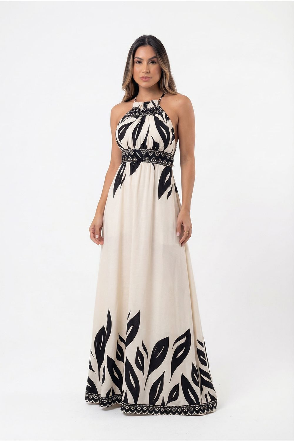 nome: vestido longo estampa folha decote regulável.