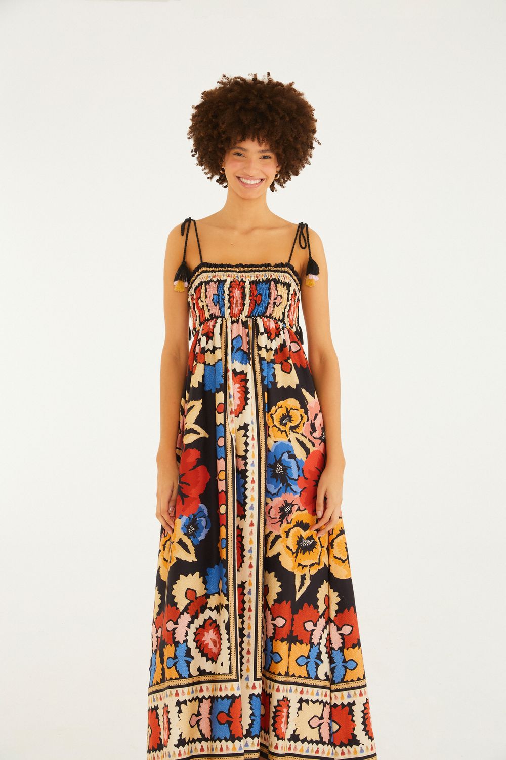 vestido longo antuerpia lenco. com alças ajustáveis e ponteiras de tassel, oferece um toque especial ao look. detalhes franzidos na parte superior e uma modelagem fluida proporcionam conforto e estilo. perfeito para ocasiões casuais ao ar livre ou eventos noturnos. FARM Rio, coleção Carioca - inverno 26.-