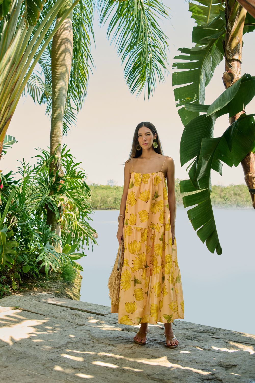 vestido longo estampado banana prata. com alças finas e decote reto, a peça em viscose traz leveza e movimento. as camadas ao longo do comprimento adicionam um charme casual, perfeito para passeios ao ar livre ou encontros especiais. uma escolha versátil e autêntica para qualquer ocasião. FARM RIO original - verão 26.-