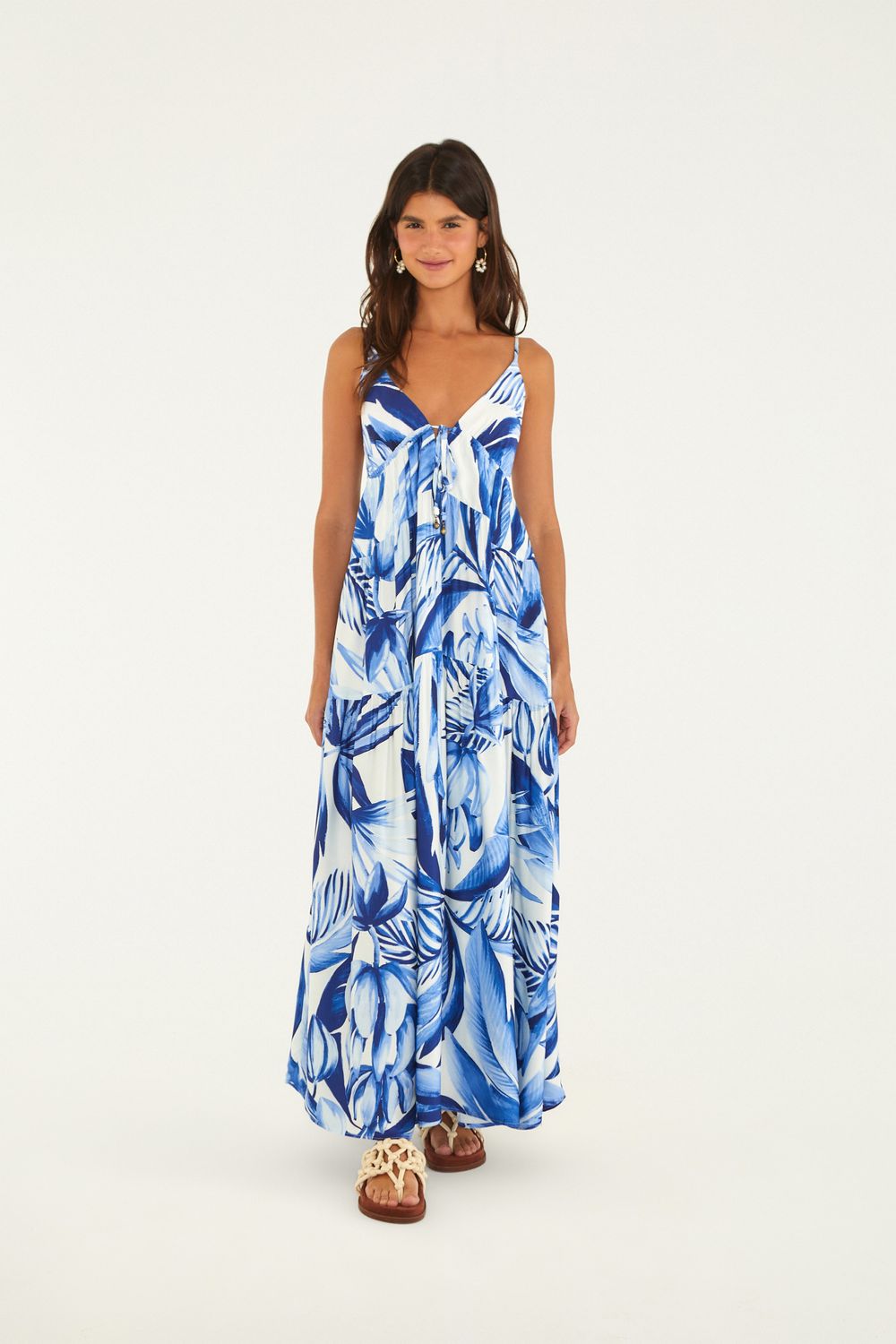 vestido longo estampado bananarte traz alças finas e decote em v que se une a uma charmosa amarração com ponteiras delicadas. sua modelagem fluida proporciona movimento e leveza, perfeita para dias ensolarados ou um jantar casual. desfrute do toque suave e da incrível estampa exclusiva. FARM Rio, coleção carioca - inverno 26.-