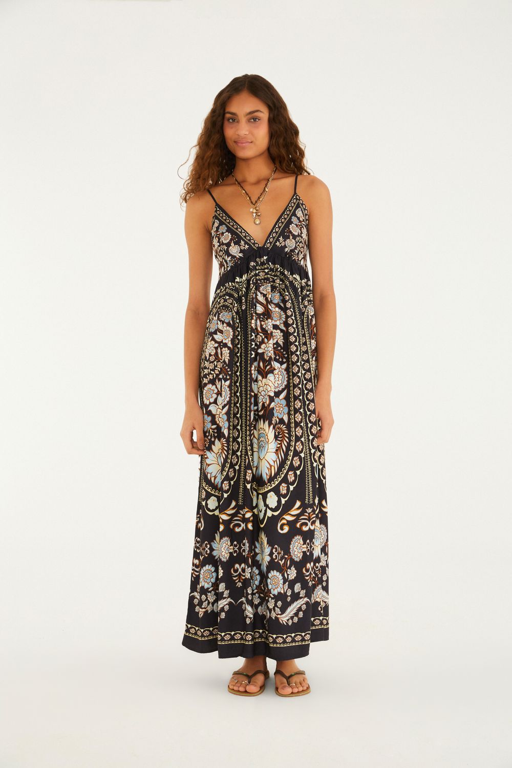 vestido longo daniela. apresenta decote profundo e alças finas que se encontram em um intrigante decote nas costas. a modelagem fluida é acompanhada de um caimento leve e confortável, ideal para passeios casuais ou ocasiões especiais ao ar livre. FARM Rio, coleção Carioca - inverno 26.-