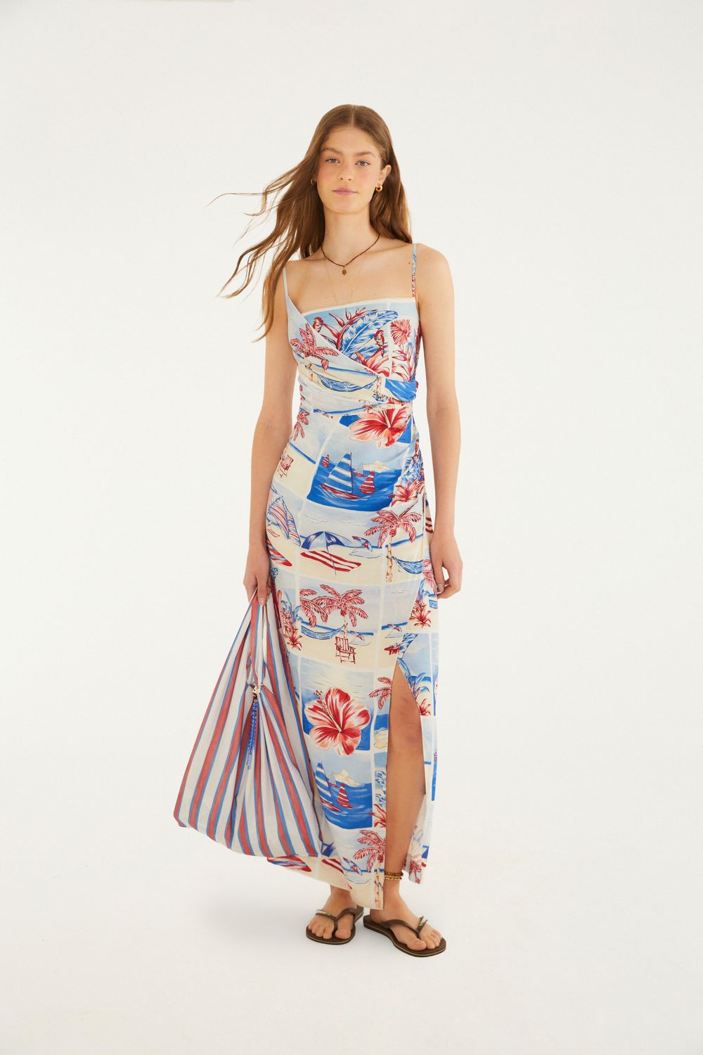 vestido longo estampado diário de verão. apresenta um design sem alças com corte fluido e fenda frontal, proporcionando um toque casual ao look. confeccionado em tecido leve, é perfeito para dias quentes e ocasiões especiais, trazendo frescor e originalidade para o seu guarda-roupa. FARM RIO original - alto verão 26.-