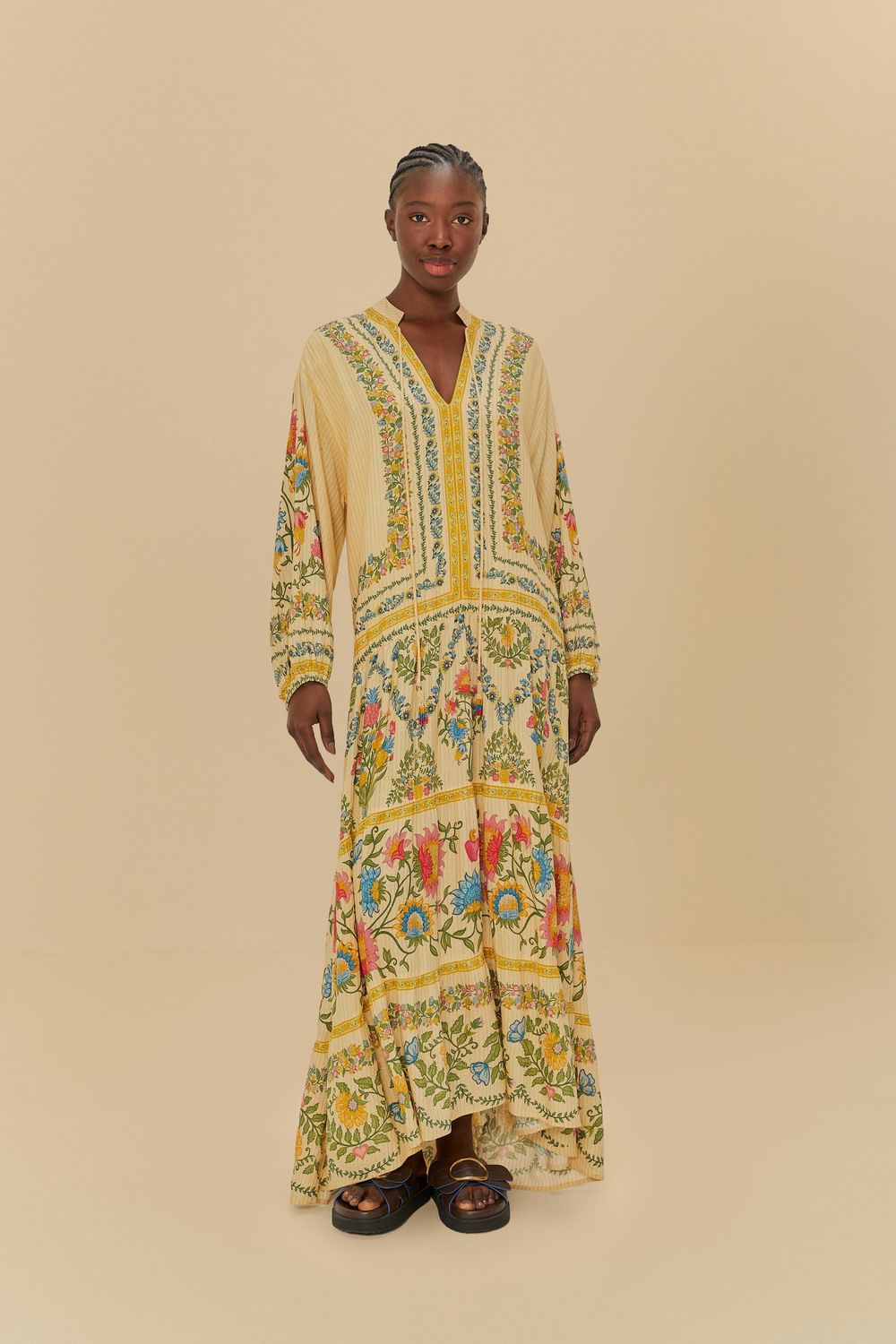 vestido longo elisa. confeccionado em tecido leve e fluído, possui decote em v que destaca suavemente o colo. as mangas longas recebem detalhe de viés e são finalizadas com elástico discreto nos punhos. a modelagem ampla traz uma sensação de liberdade e conforto, ideal para ocasiões casuais e encontros especiais. FARM RIO original - inverno 25.-