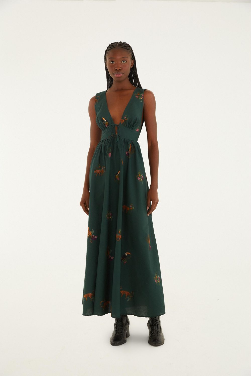 vestido longo estampado florestinha. possui decote em v profundo e alças largas que trazem conforto e segurança. a cintura possui elástico que define suavemente a peça. ideal para passeios ao ar livre ou eventos que pedem um visual casual e cheio de personalidade. FARM RIO original - alto inverno 25.-
