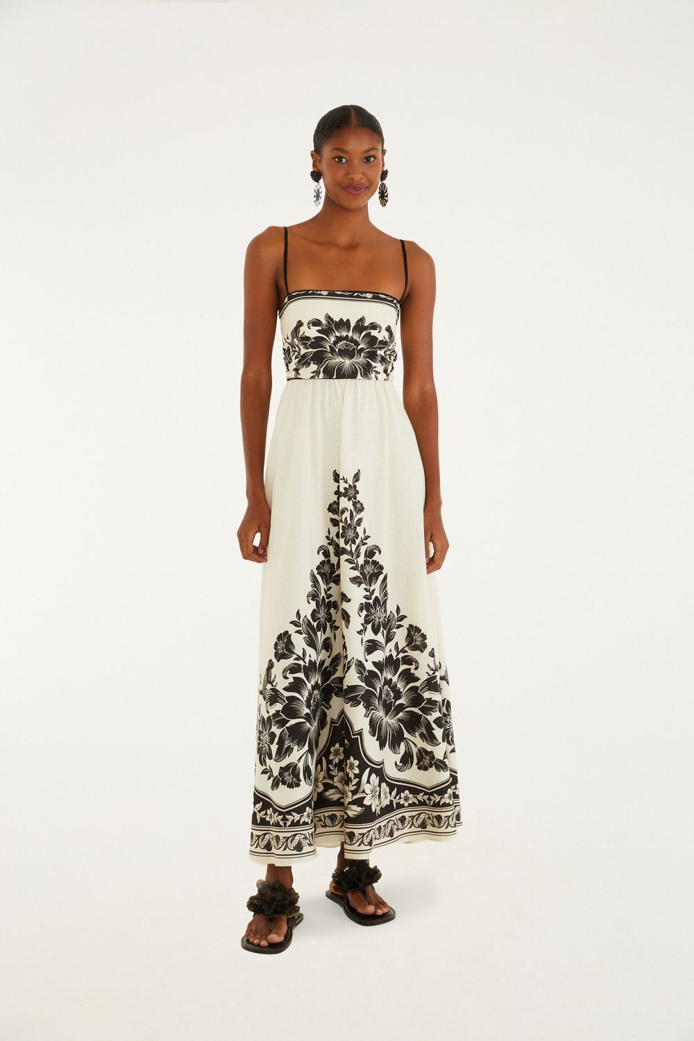 vestido longo estampado guanacaste. apresenta decote em v com alças ajustáveis, permitindo conforto e ajuste perfeito. a saia fluida com leves babados confere movimento e delicadeza à peça, ideal para eventos casuais ou almoços ao ar livre. os detalhes sutis nos acabamentos transformam cada uso em uma experiência única. FARM RIO original - verão 26.-