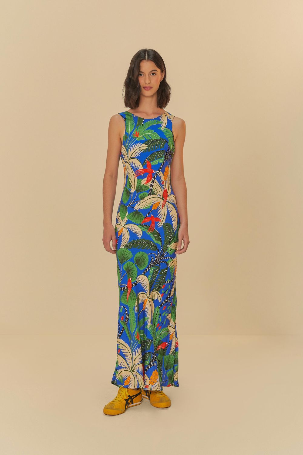 vestido longo estampado ilha da noite. com decote em u e alças médias que destacam o charme casual da peça. a modelagem reta e o caimento fluido proporcionam conforto e movimento. ideal para encontros especiais ou passeios pela cidade, eleva qualquer guarda-roupa com seu design único e atraente. FARM RIO original - inverno 25.-