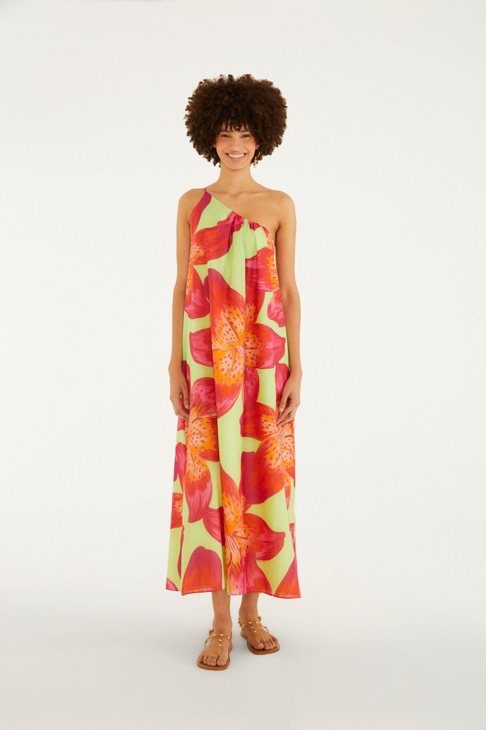vestido longo estampado lírio tropical. com um charmoso decote um ombro só, possui caimento fluido e corte evasê que proporcionam leveza nos movimentos. ideal para dias ensolarados, passeios na praia ou um brunch casual. os acabamentos impecáveis completam essa peça indispensável no guarda-roupa. FARM RIO original - alto verão 26.-