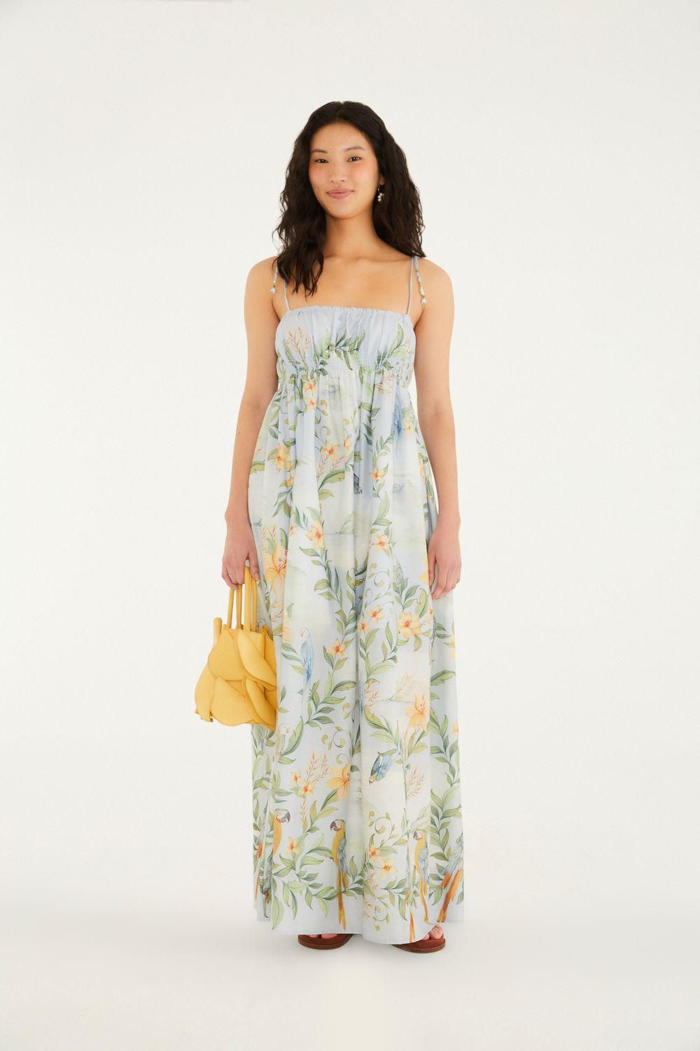 vestido longo paisagem rio. decote reto com alças finas ajustáveis, trazendo leveza e fluidez. tecido em viscose que proporciona caimento suave. ideal para um passeio ao ar livre ou eventos casuais, capturando a essência descontraída do rio. um toque de verão em qualquer estação. FARM Rio, coleção Carioca - inverno 26.-