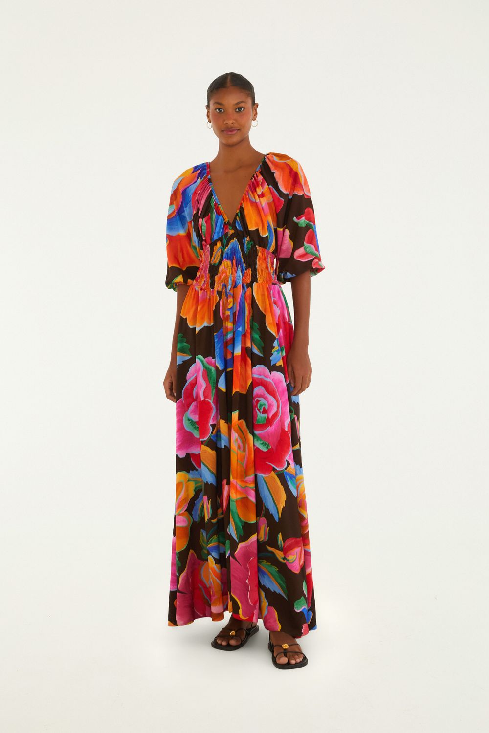 vestido longo estampado rosas pintadas. possui decote v com cordinha para ajuste, trazendo charme e delicadeza. as mangas curtas levemente bufantes são um toque extra de conforto e estilo. confeccionado em tecido leve, é perfeito para um passeio casual ou uma noite agradável. a modelagem solta prioriza o conforto sem perder o estilo. FARM RIO original - verão 26.-