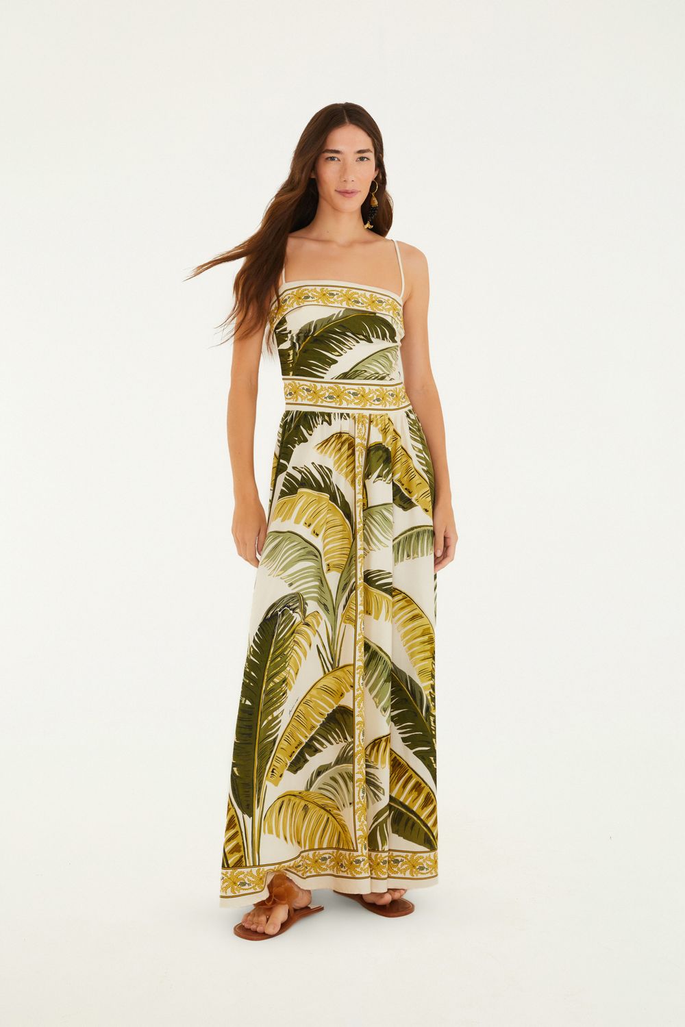 vestido longo estampado trancoso. ele possui decote reto, alças finas e modelagem solta que proporciona conforto e leveza. a peça é ideal para momentos casuais, do passeio ao ar livre a uma ocasião especial. confeccionado em tecido de alta qualidade, garante um toque suave na pele. FARM RIO original - verão 26.-