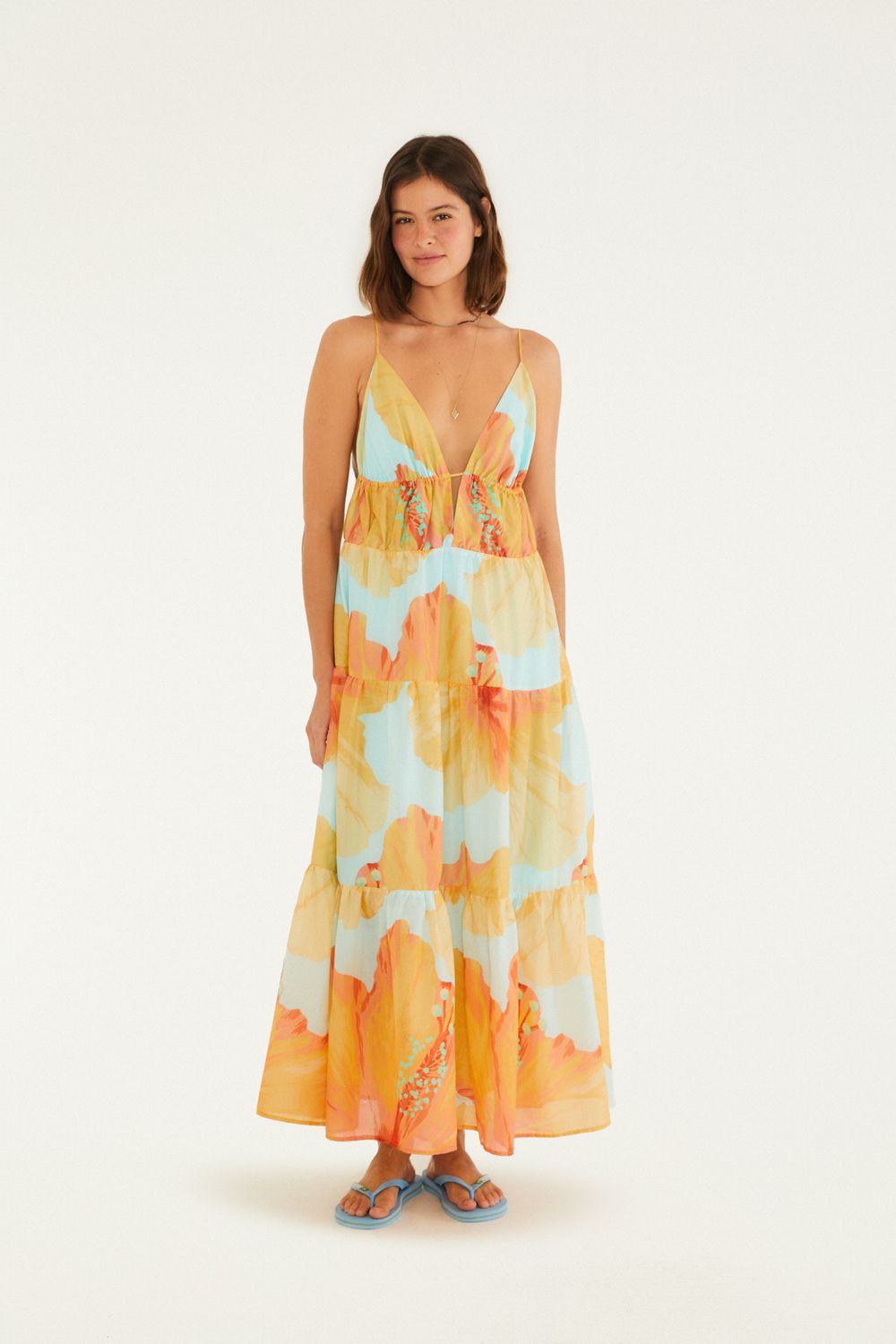 vestido longo estampado vestida de flor. possui alças finas e decote profundo, trazendo leveza e um toque especial. a saia ampla e fluida complementa a modelagem soltinha, proporcionando movimento e conforto. perfeito para ocasiões casuais e momentos ao ar livre, com o charme que só a farm oferece. FARM RIO original -alto verão 26.-