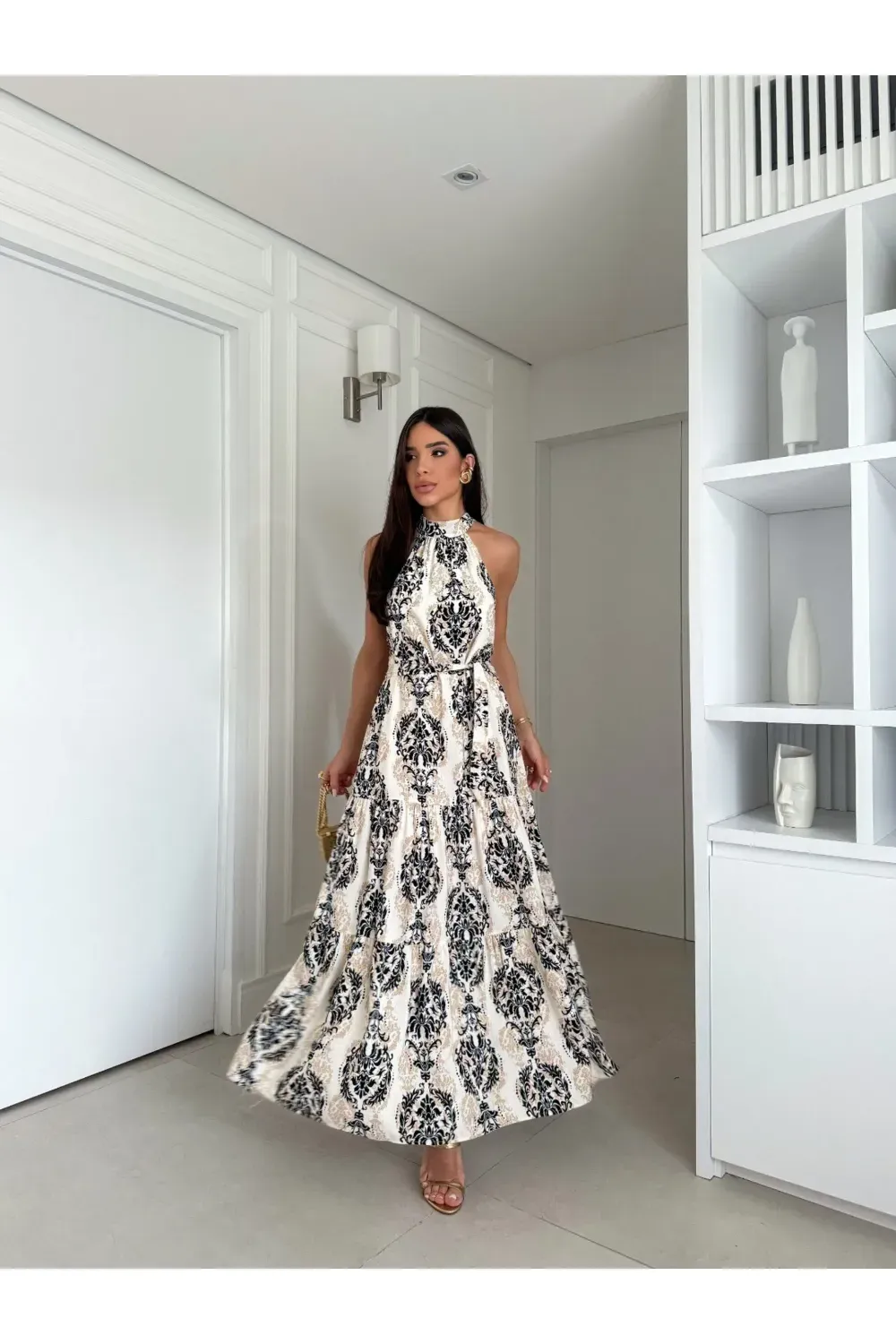 nome: vestido longo gola alta estampa renda.